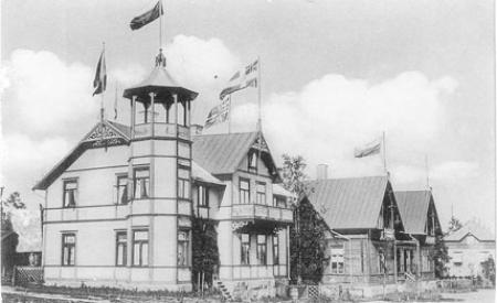 Bilden visar Tornvillan i festdräkt täckt med flaggor och vimplar (fotot tillhör stadsarkitektkansliet).